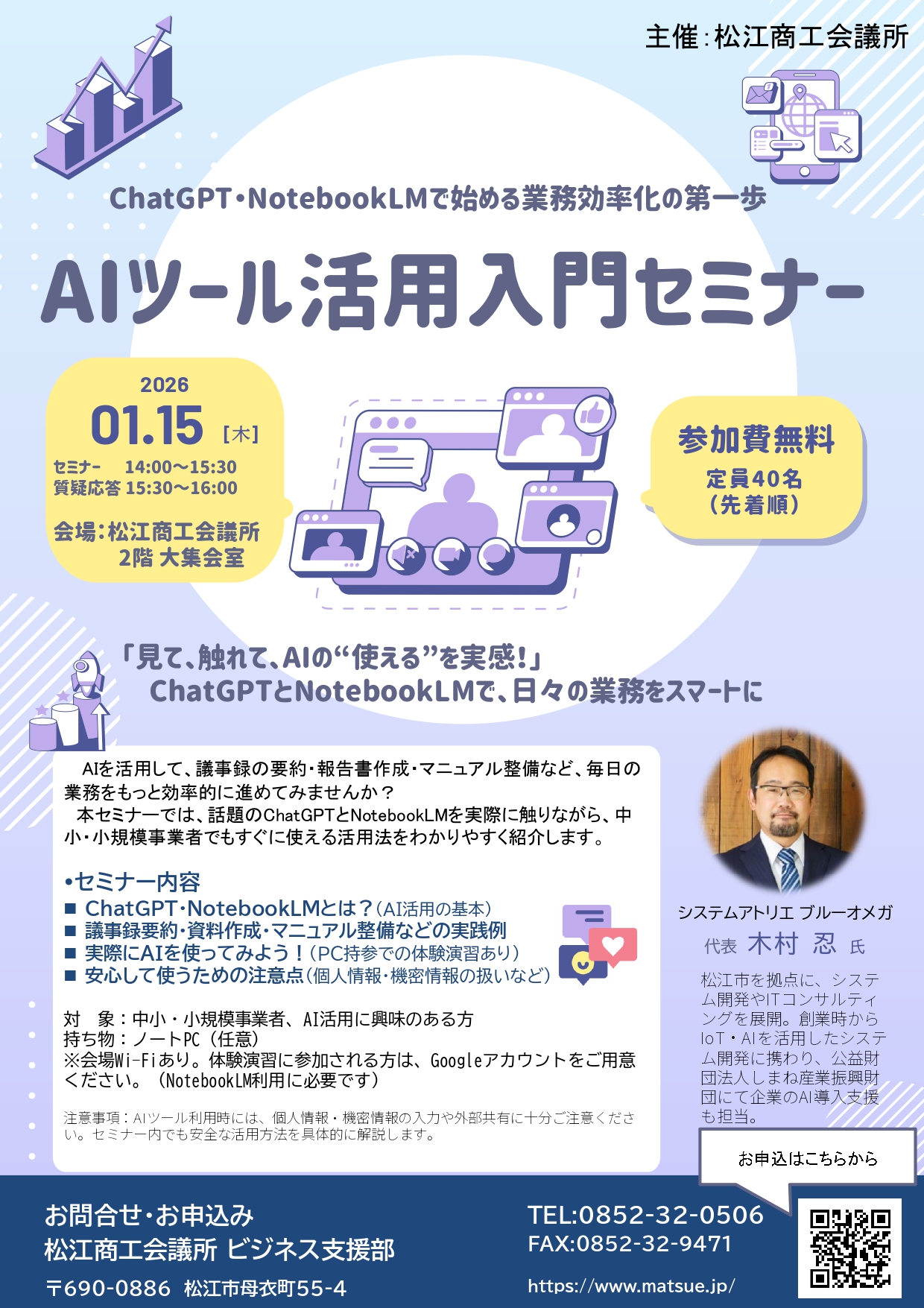本セミナーでは、話題のChat GPTとNotebookLMを実際に触りながら、中小・小規模事業者でもすぐに使える活用法を分かりやすく紹介します。
