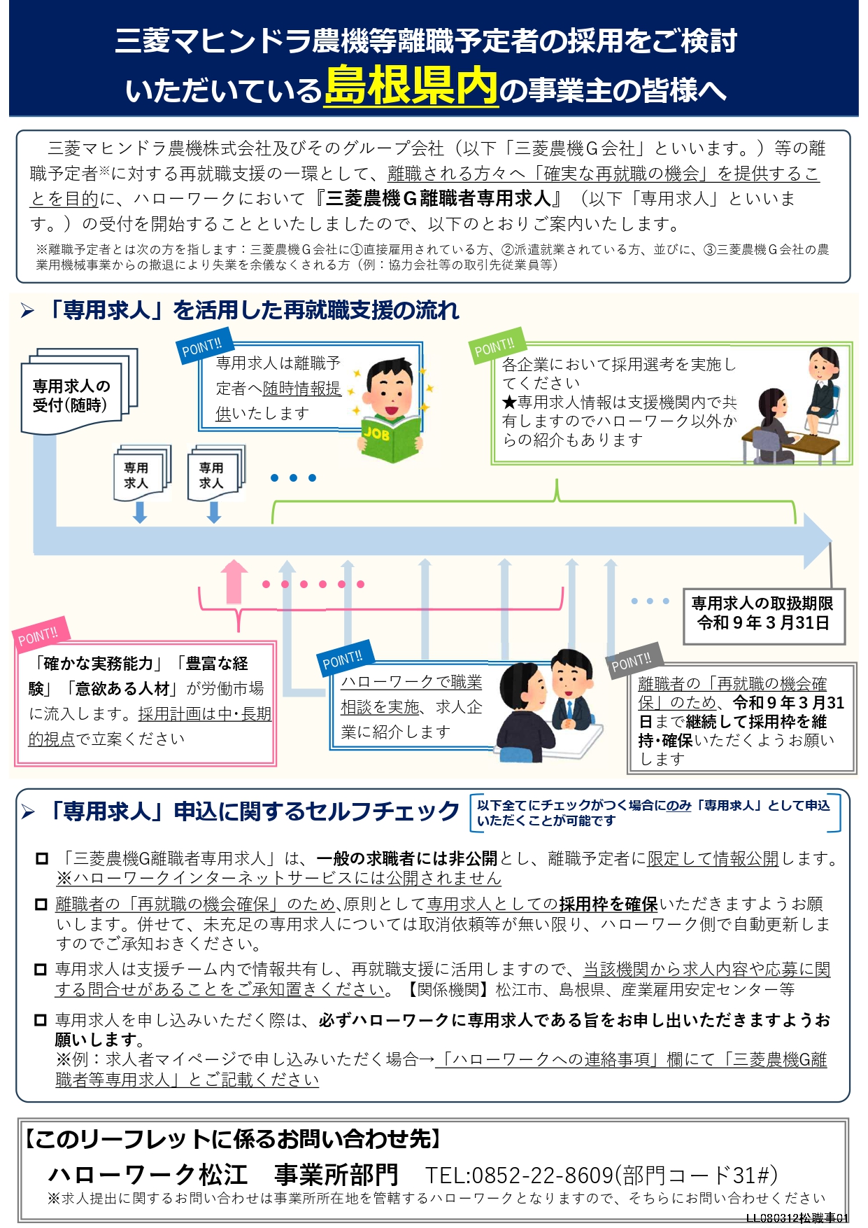 ハローワーク松江では、三菱マヒンドラ農機株式会社及び関連企業の従業員の皆さまや取引先事業者さまに対し、就職支援チーム(松江市、島根県、松江商工会議所、産業雇用安定センターなど)と連携し、以下の支援を実施されます。